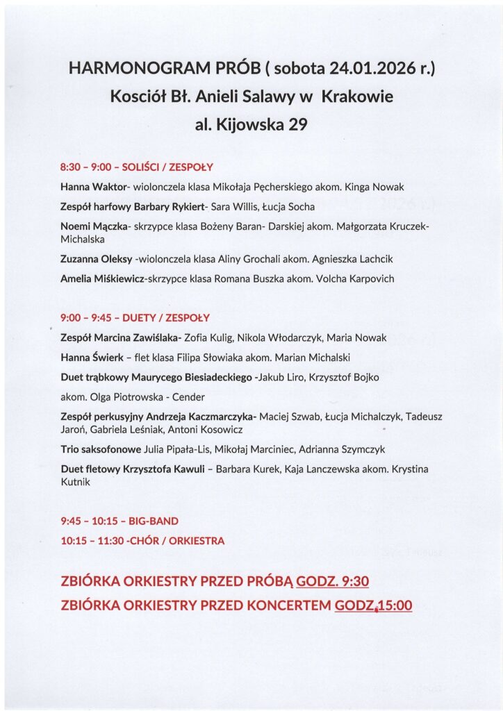 Koncert kolęd – harmonogram prób (sobota 24.01.2026 r.) Kościół Bł. Anieli Salawy w Krakowie, al. Kijowska
