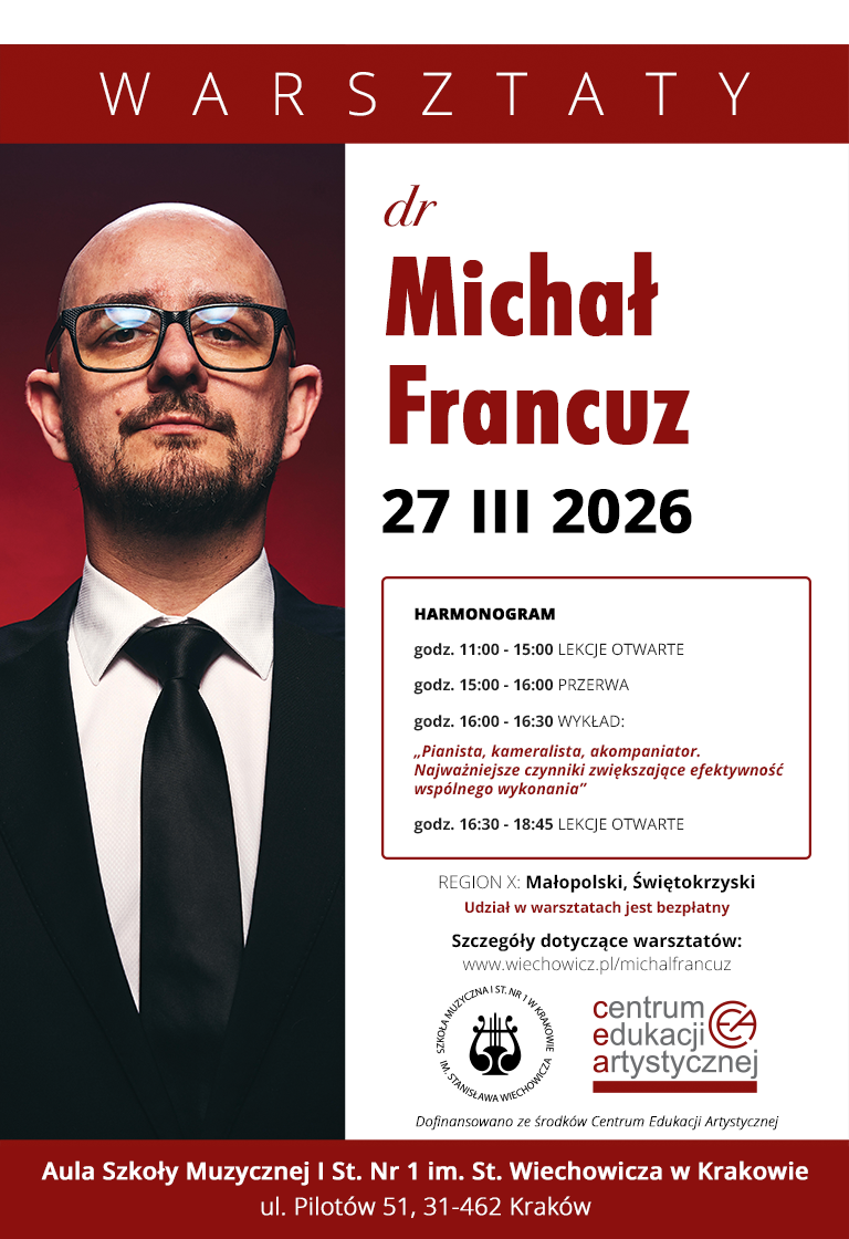 | Nazwa: Warsztaty dla nauczycieli pianistów-kameralistów i akompaniatorów szkół muzycznych I i II stopnia Forma: Wykład i warsztaty Temat: „Pianista, kameralista, akompaniator. Najważniejsze czynniki zwiększające efektywność wspólnego wykonania„ Wykładowca: dr Michał Francuz | 27 marca 2026 r. | Miejsce: Szkoła Muzyczna I st. Nr 1 im. Stanisława Wiechowicza w Krakowie ul. Pilotów 51 31-462 Kraków tel. 12 411 49 05 sekretariat@wiechowicz.pl |