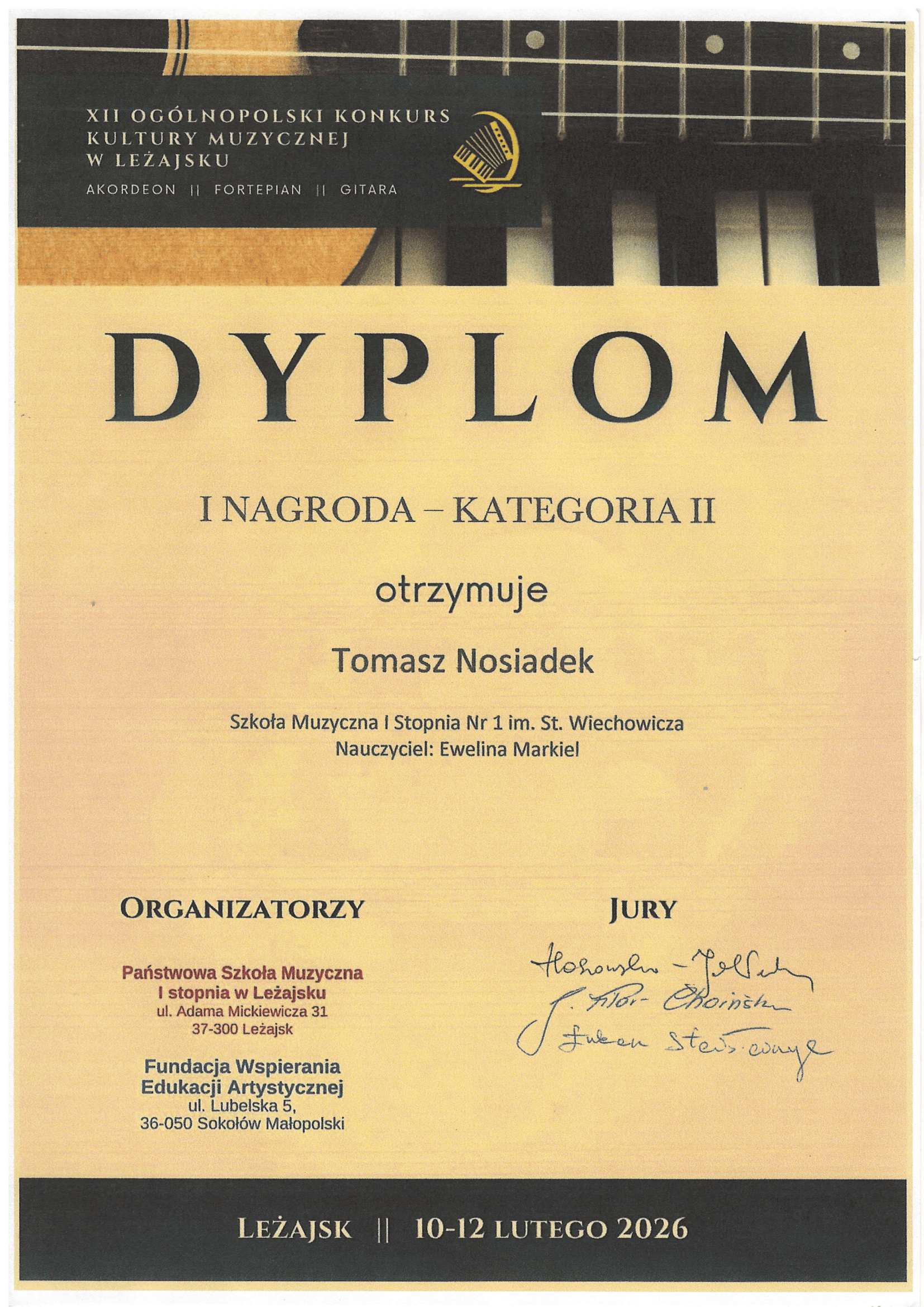 XII Ogólnopolski Konkurs Kultury Muzycznej w Leżajsku I MIEJSCETomasz Nosiadek (fortepian)Przygotowanie: Ewelina Markiel