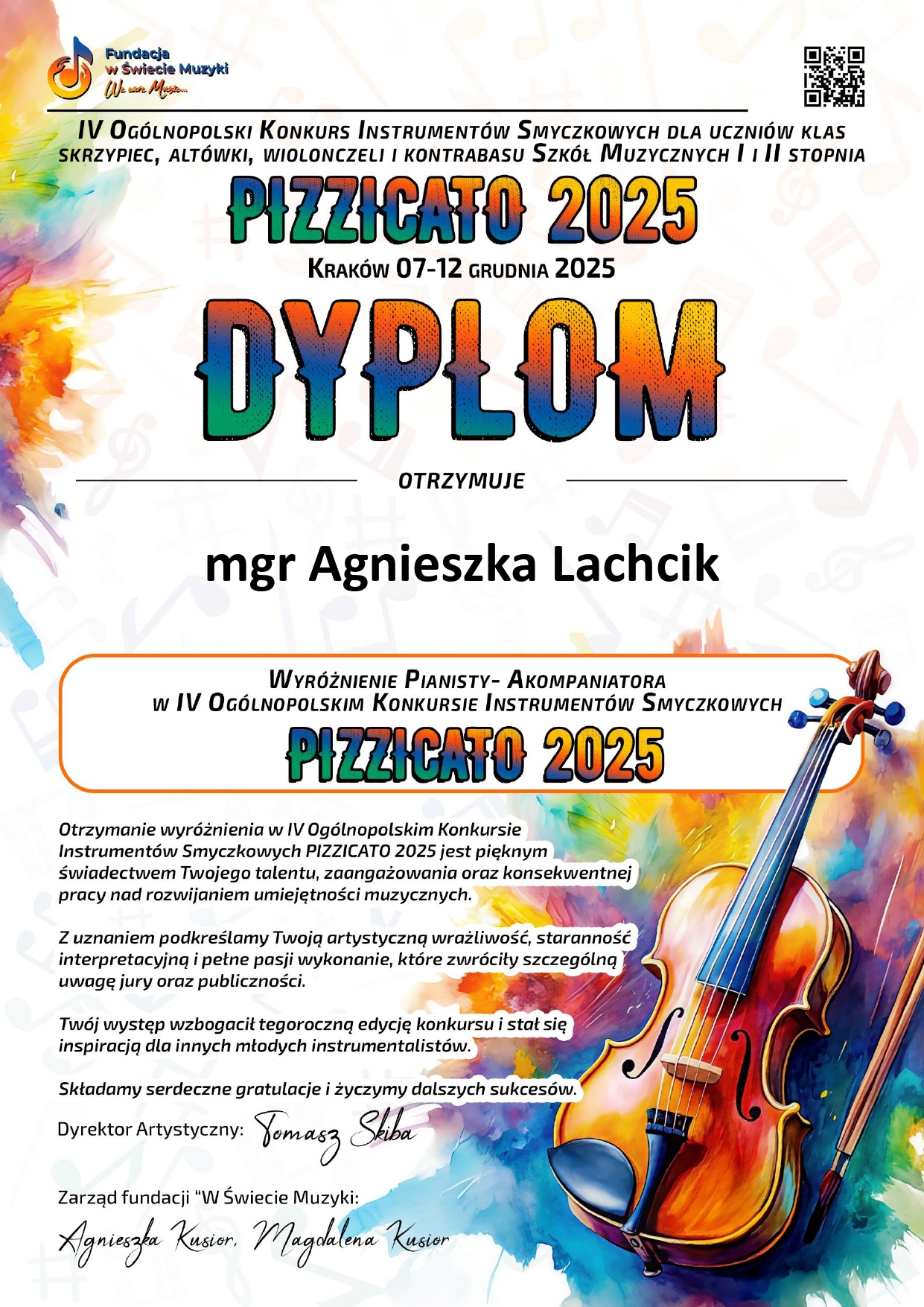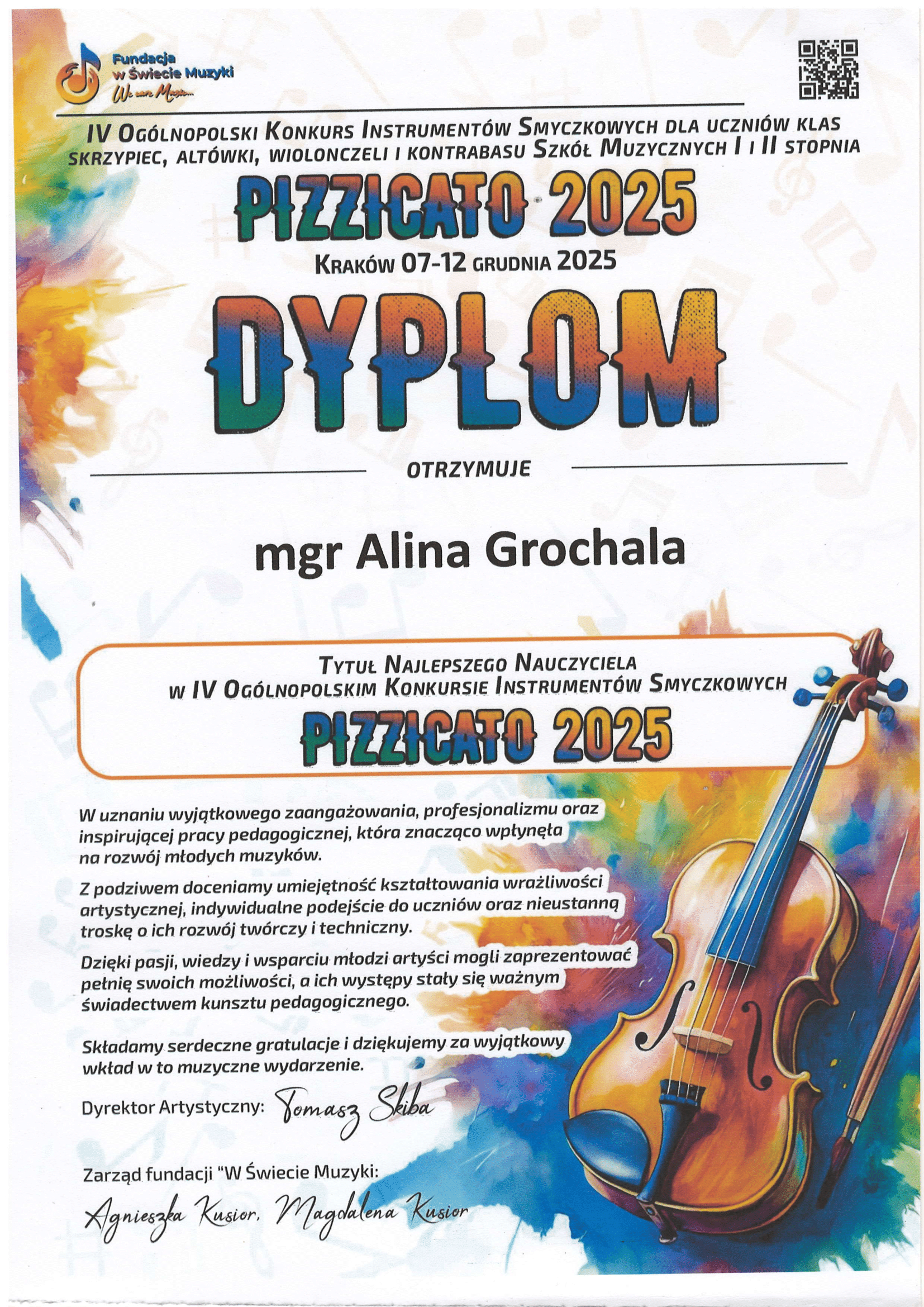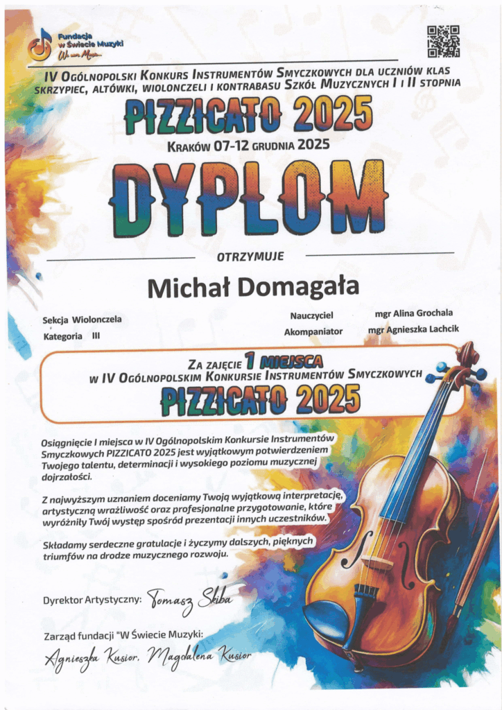 IV OGÓLNOPOLSKI KONKURS INSTRUMENTÓW SMYCZKOWYCH DLA UCZNIÓW KLAS SKRZYPIEC, ALTÓWKI, WIOLONCZELI I KONTRABASU SZKÓŁ MUZYCZNYCH I i II STOPNIA PIZZICATO 2025