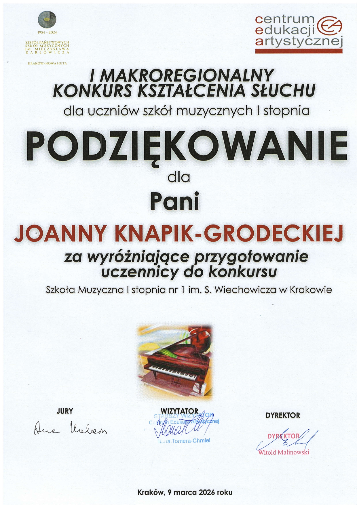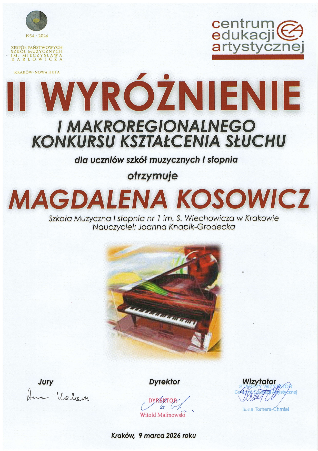 I Makroregionalny Konkurs Kształcenia Słuchu II WYRÓŻNIENIEMagdalena Kosowicz (kształcenie słuchu)Przygotowanie: Joanna Knapik-Grodecka